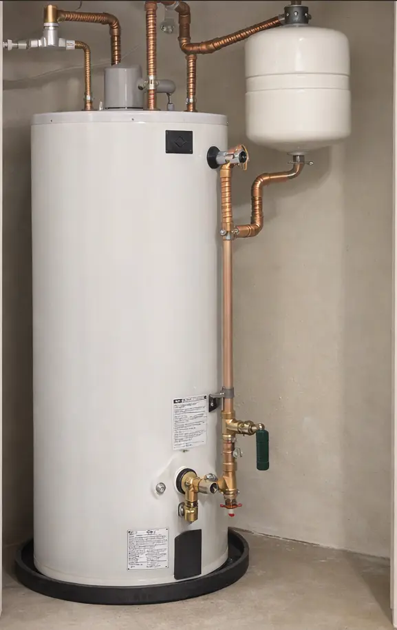 We replaced the old unit with a high-recovery tank and installed a new thermal expansion tank to meet local codes. We also swapped the cheap plastic drain valve for a professional-grade brass one so the office can easily flush out sediment in the future.